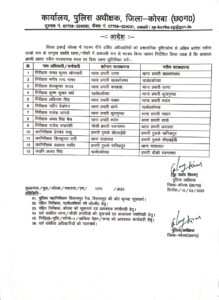 कोरबा// पुलिस अधीक्षक उदय किरण की पुलिस विभाग में बड़ी सर्जरी 9 नगर निरीक्षकों 3 सब इंस्पेक्टर और एक एएसआई का किया तबादला, देखिए सूची