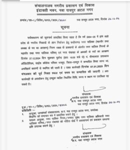 छत्तीसगढ़रायपुर बिग ब्रेकिंग :- नगरी निकाय चुनाव के लिए होने वाली आरक्षण स्थगित..अब इस तारीख को होगा आरक्षण… By Manish - December 26, 2024 263 FacebookTwitterPinterestWhatsApp नगरी निकाय चुनाव के लिए होने वाली आरक्षण स्थगित..अब इस तारीख को होगा आरक्षण… रायपुर।। देखे आदेश-महापौर, पालिका और नगर पंचायत अध्यक्ष के लिए कल होने वाला आरक्षण स्थगित कर दिया गया है।