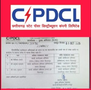 छत्तीसगढ़ स्टेट पावर डिस्ट्रीब्यूशन कंपनी लिमिटेड (CSPDCL) ने अधिकारियों के तबादले की सूची जारी की है। यह आदेश 1 अक्टूबर 2025 से प्रभावी होगा।